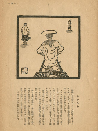 立石鐵臣於1944年為須藤利一《南島覺書》封面進行設計,純粹以素雅字體展現不同於以往的設計風格,顛覆過往大家熟悉的「民俗圖繪」或版畫形式。