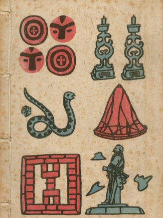 1942年日孝山房出版西川滿、池田敏雄合著的《華麗島民話集》,由立石鐵臣繪製封面及內頁插畫,此書封面將12個圓圈以紅、黑2色組成,上方6個圓圈以榜書字體書寫「華麗島民話集」6字,整體呈現精神飽滿的大氣風範。封底則以12個圓圈繪製十二生肖圖案,從右下角一鼠、二牛、三虎至十二豬的生肖,採取順時針向內環繞的回字形編排,形成有趣的閱讀走向。